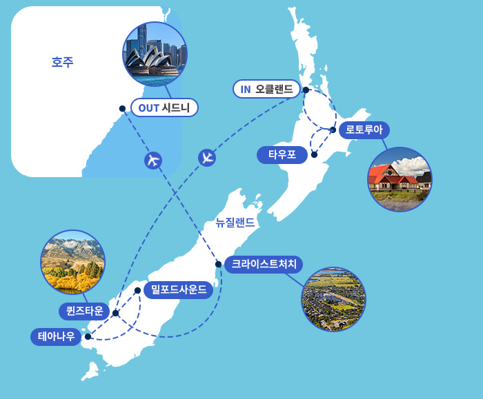 - 국내선: 호주, 뉴질랜드 내 국내선 2회 이동으로 차량 이동 최소화로 여유로움 PLUS 편안함 UP