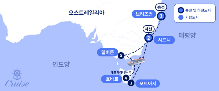 [크루즈 객실 타입 발코니 선실 업그레이드 희망시, 추가 비용이 발생합니다.]☞ 가능여부, 추가금 담당자 문의[도시 안내] ▶ 퀸즐랜드의 햇살과 활기가 넘치는 주도 브리즈번 관광▶ 호주의 상징적인 주도 시드니 관광▶ 호주 식민지 시대의 역사를 느낄 수 있는 포트아서 관광▶ 태즈매니아의 주도, 다양한 동식물의 서식지 호바트 관광▶ 호주 문화와 예술의 중심지로, 우아한 도시의 매력이 돋보이는 곳 멜버른 관광